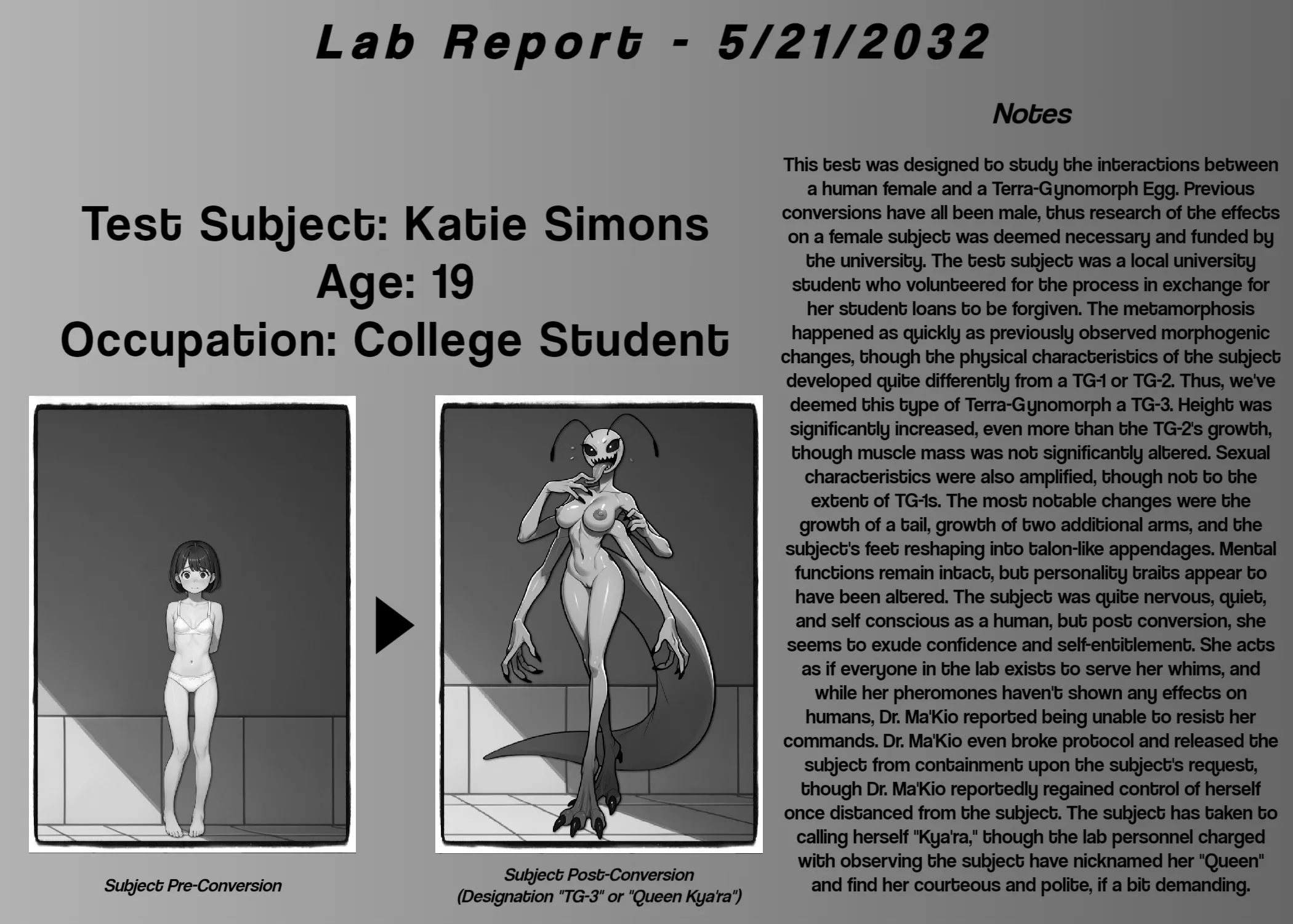 Katie Simons is a 19 year old college student who volunteers to become the first human female to make contact with a Terra-Gynomorph egg in exchange for her student debt to be forgiven. The conversion process seems like a standard Type-1 metamorphosis at first, but things aren’t always as they seem…