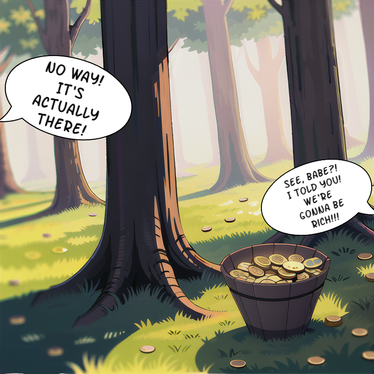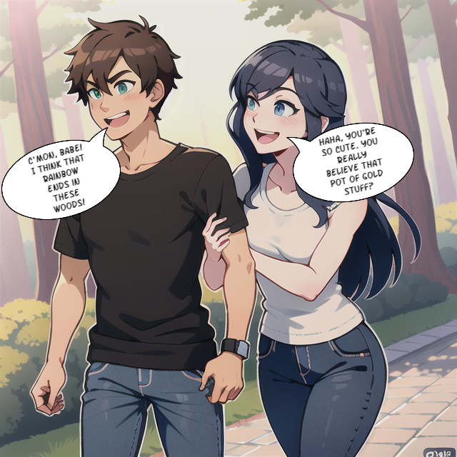 A young couple are strolling through the woods in search of the rumored pot of gold that lies at the end of a rainbow. They quickly learn that ownership of the gold will require some adjustments~
