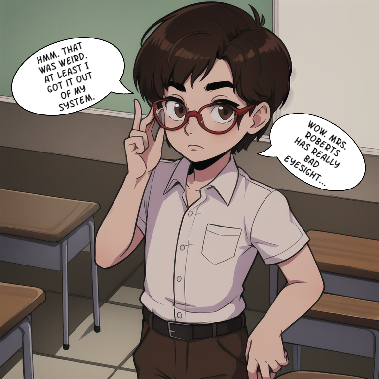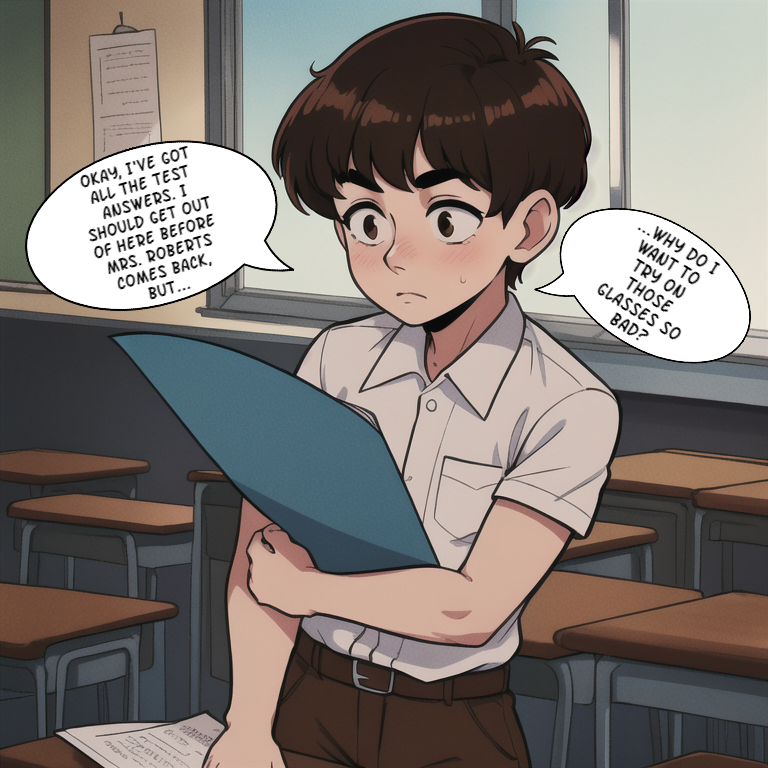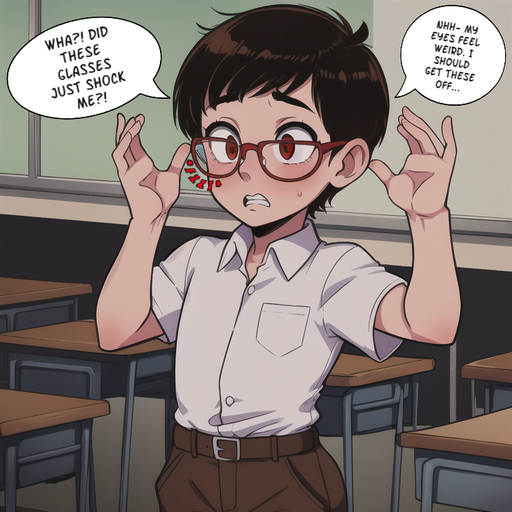 A nerdy, bullied schoolkid is being forced by the jocks in his class to steal the answers for an upcoming biology class, or get beat up after school. Reluctantly, the nervous boy sneaks into the classroom between periods to find the teacher’s answer key, but finds something a little extra. The teacher’s glasses are sitting suspiciously on the center of her desk, as if they’re asking to be taken. The boy doesn’t know why, but he feels the urge to try on the peculiar lenses before leaving with the test answers. He doesn’t know it yet, but by the time next period starts, he’ll know all the answers to the upcoming test, and he won’t have to worry about being bullied ever again…